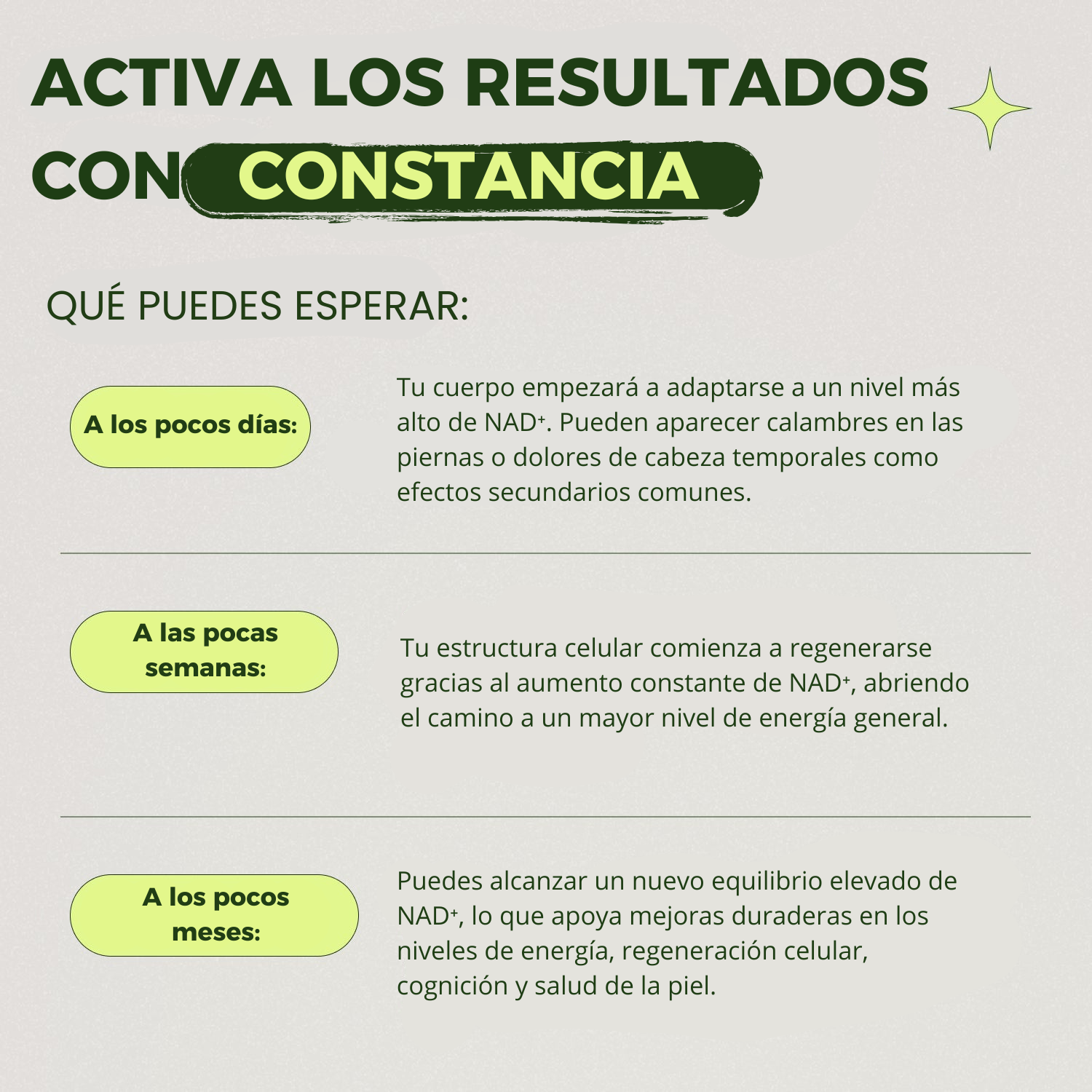 El NAD+ (Nicotinamida Adenina Dinucleótido) es una coenzima esencial presente en todas nuestras células, responsable de procesos críticos como la producción de energía, reparación del ADN y ralentización del envejecimiento celular. Con los años, sus niveles disminuyen, lo que contribuye a la fatiga, pérdida de concentración y envejecimiento acelerado.