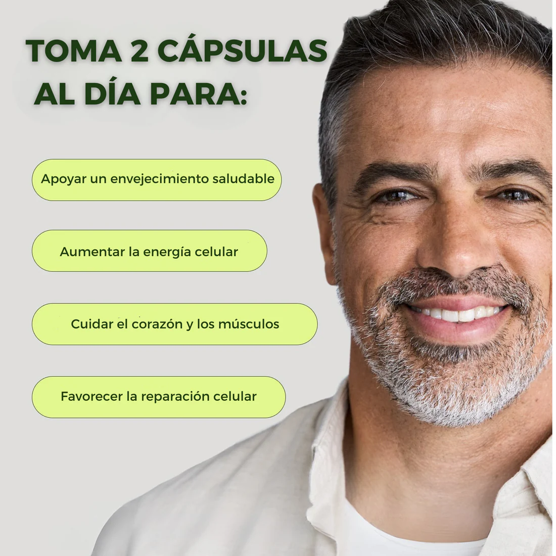 Estimula vías de reparación del ADN y activa sirtuinas, proteínas clave en el envejecimiento saludable. Favorece una mayor vitalidad y protección frente al estrés oxidativo.