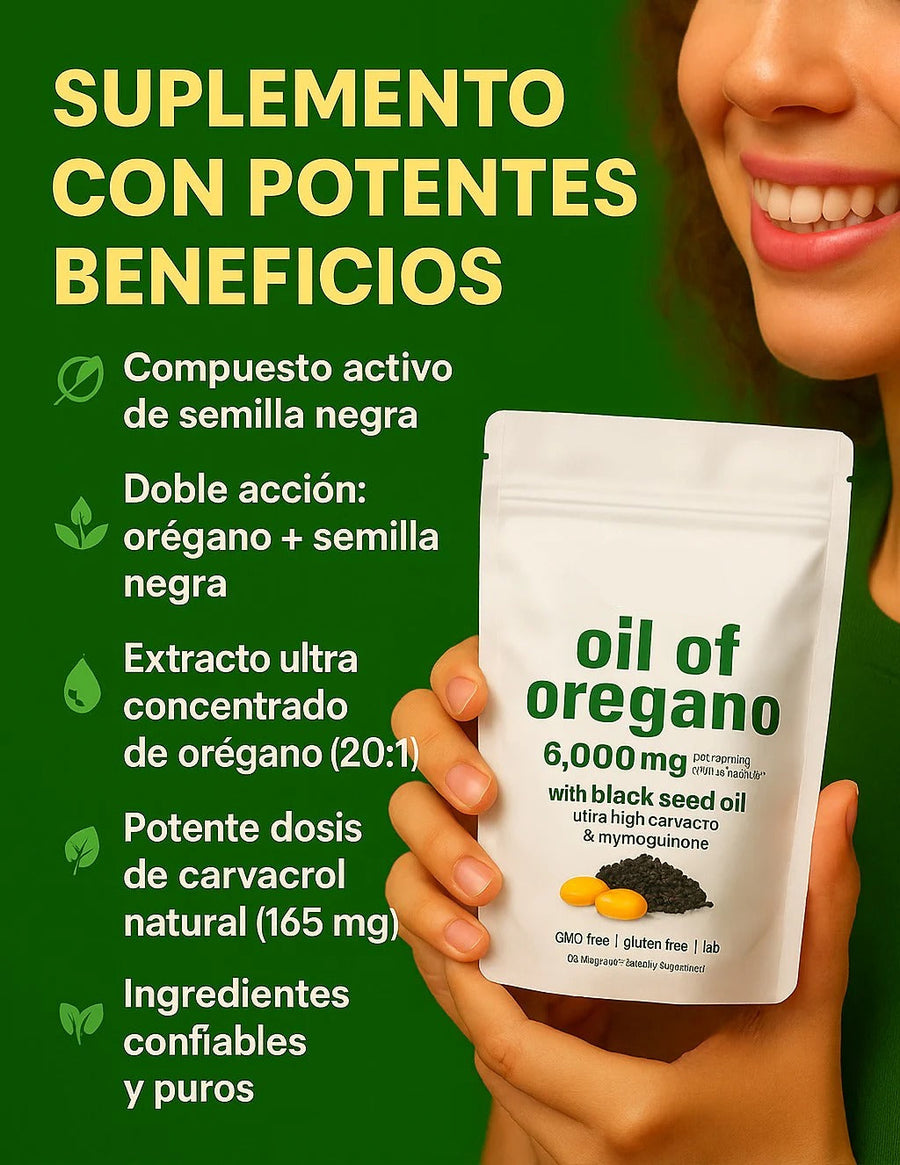 Aceite de orégano (carvacrol) + semilla negra (timoquinona): dos superingredientes en una cápsula.